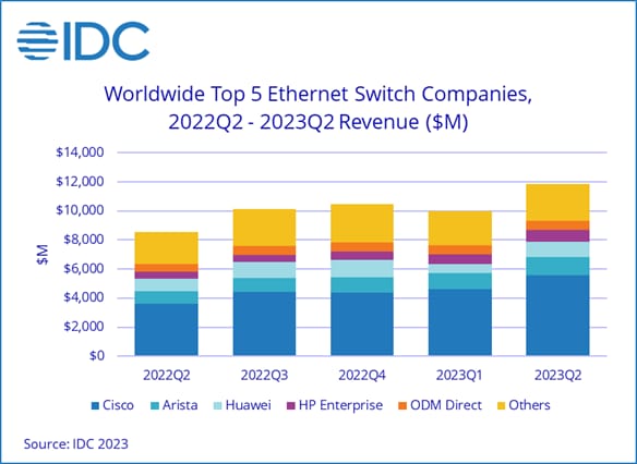 Arista Networks n’est pas la seule entreprise proposant du matériel réseau avancé. Parmi ses concurrents directs, nous pouvons compter Cisco, Huawei, Juniper Networks, H3C et Aruba Networks (filiale du groupe Hewlett Packard Enterprise — HPE). D’après l’étude d’IDC, les parts de marchés sur les router et switchs à destination des datacenters au second trimestre de 2023 s’établissait comme suit: Cisco premier avec 47,2% de parts de marchés, suivi par Arista Networks avec 10,2%, puis Huawei avec 9%, HPE avec 7,1%, H3C avec 4,1% pour finir avec Juniper avec 2,9%.