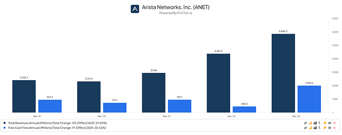 Pour ce qui est de l’utilisation de la trésorerie, nous pouvons voir qu’Arista Networks a investi environ 855M$ en Recherche et Développement et a procédé au rachat d’action à hauteur 145,8M$ en 2023 (Pour rappel, le bénéfice net est de 2,08B$ pour l’exercice 2023).