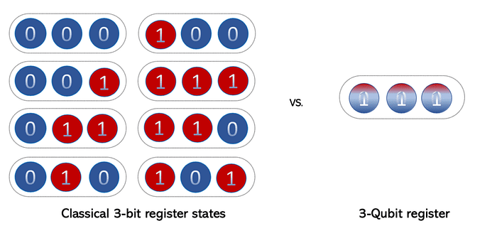Par exemple, un registre de 4 bits donne 16 combinaisons différentes. Avec un registre de 4 qubits, on peut représenter 16 états différents à la fois ce qui divise le temps de calcul par 16. De manière générale, avec un registre de N qubits, on peut représenter 2ᴺ états.