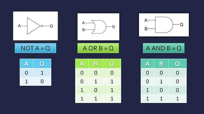 Un ordinateur manipule ces séquences de bits grâce à des portes logiques. Il en existe plusieurs, mais les plus fondamentales sont la porte NOT, qui inverse un signal (0 devient 1 et inversement), la porte AND, qui ne renvoie 1 que si les deux entrées sont à 1, et la porte OR, qui renvoie 1 si au moins une des entrées est à 1.