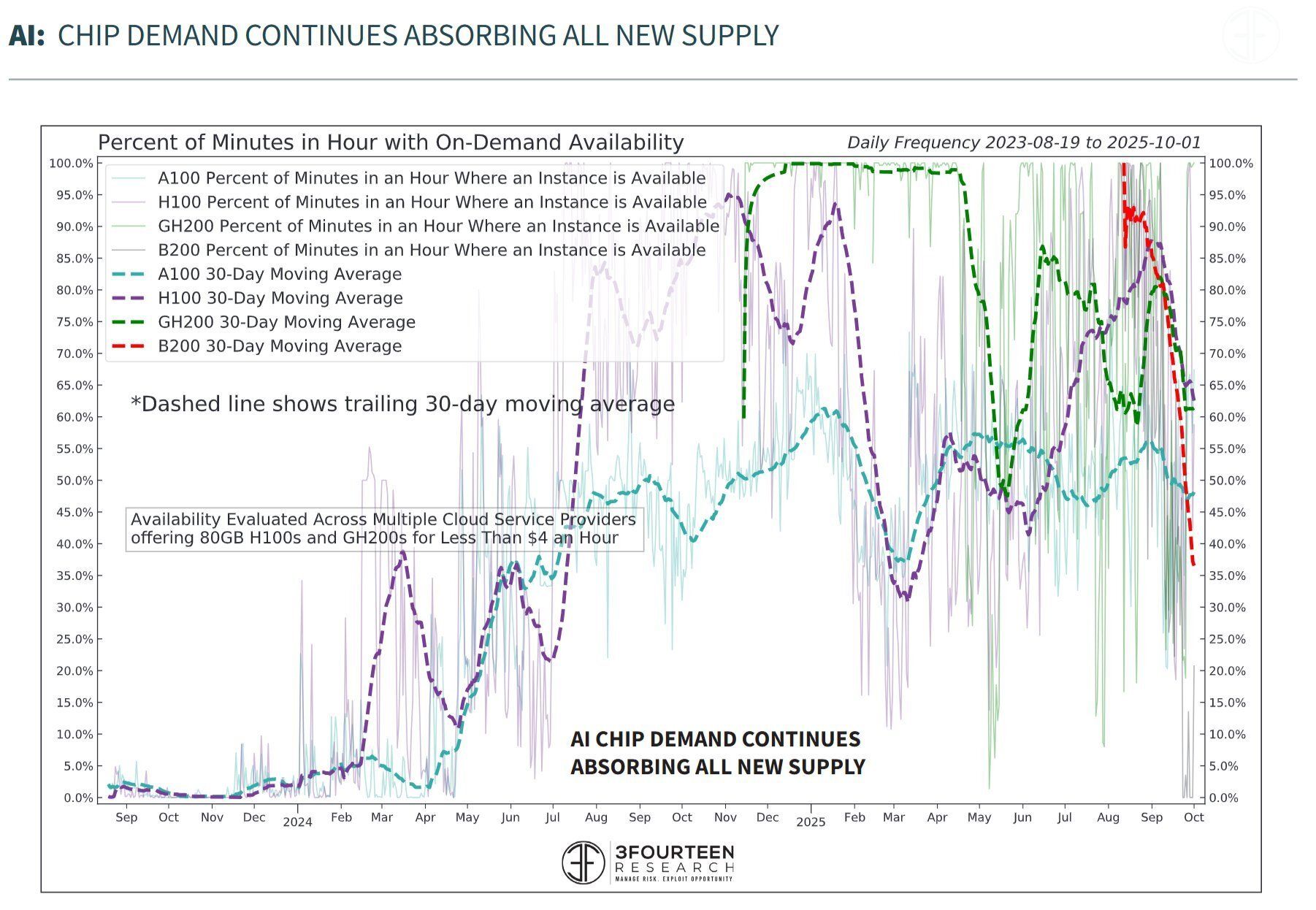 On peut y voir notamment qu’en Octobre, la disponibilité des A100 était plus faible🔻 qu’en Janvier/Février dernier, pour une puce vieille de 5 ans, alors même que des clusters NVL72 GB200/300 sont en train d’être déployés massivement…