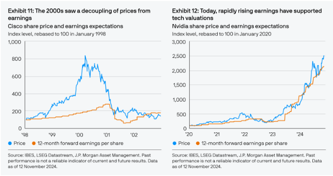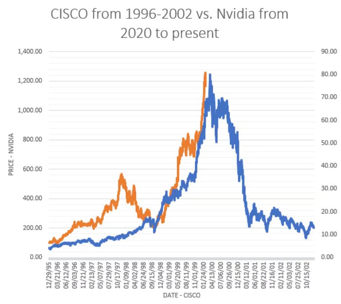 Cependant, Michael Burry ne s’est pas arrêté là: il a comparé Nvidia à Cisco pendant la bulle 🫧 internet. Et il n’est d’ailleurs pas le seul, on peut régulièrement voir des graphiques comme celui ci-dessous 👇