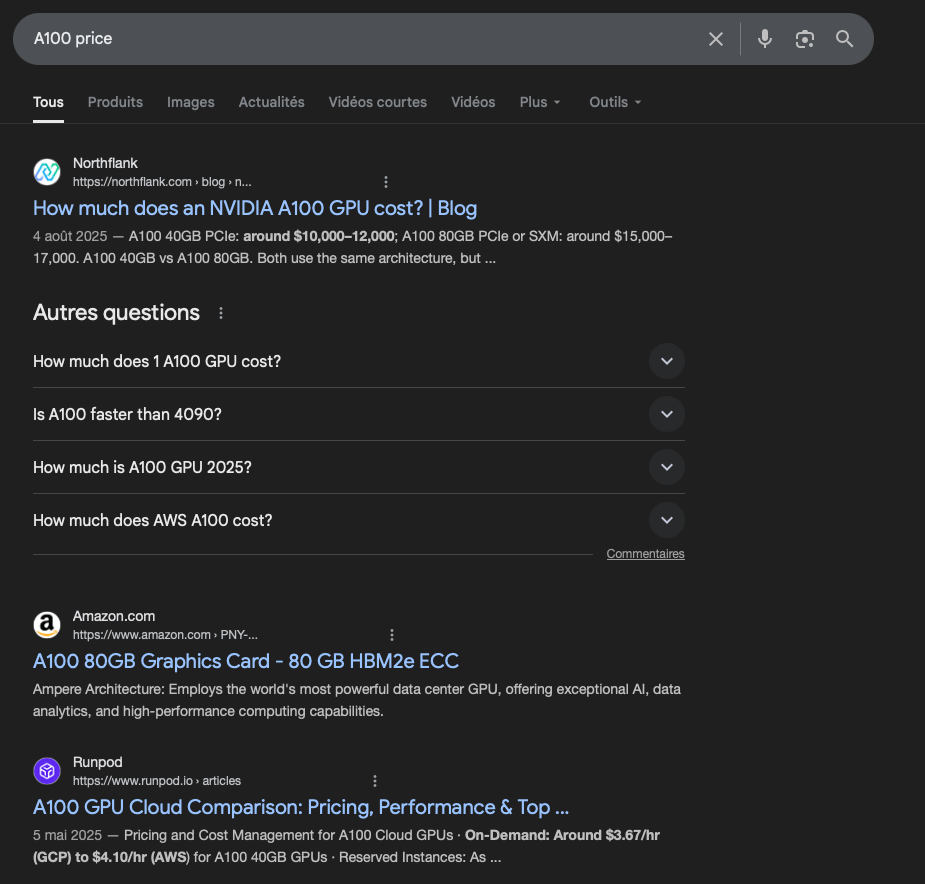 Une A100 consomme au maximum 400W ⚡. Soyons un peu généreux et estimons que le réseau consomme 400W supplémentaire (il consomme probablement beaucoup moins que ça). Ça fait une consommation maximale de 800W. Dans la réalité, on est plus proche des 50-70% de charge, même en pay-as-you-go, ce qui fait une consommation totale de 560W soit 0.07$ à 0.0784$ par heure.