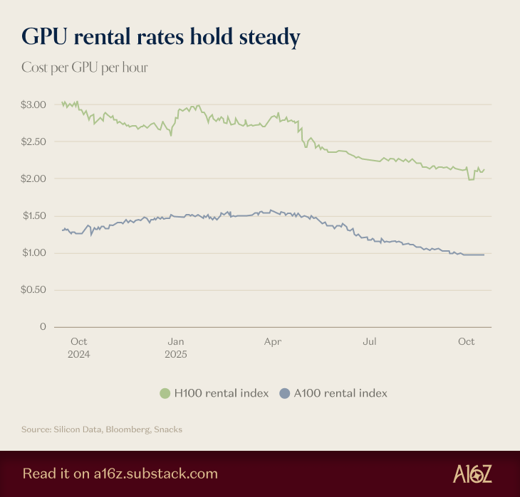 Concernant le prix à la location, c’est exactement la même dynamique. Même si les prix à l’heure sont à la baisse 📉 parce que Blackwell commence à être disponible, on remarque une forte stabilité des prix…