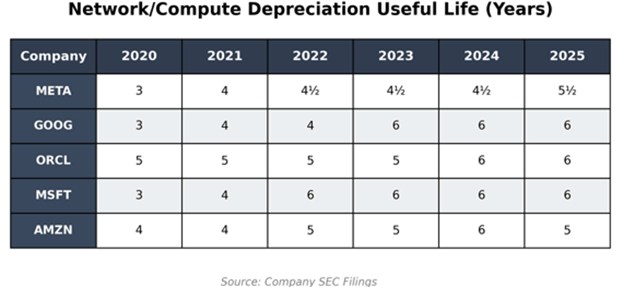 Et cette mécanique financière que Burry pointe du doigt 🫵 en accusant les hyperscalers d’augmenter la durée de dépréciation pour maquiller leurs comptes et les faire apparaître meilleurs qu’ils ne le sont réellement, soutenant artificiellement les cours de bourse.